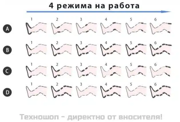- Режим D: При този режим на работа, апаратът надува едновременно всички възглавници, след което ги отпуска и започва отново.