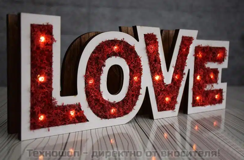 Светещ надпис “LOVE“ от истински полярен Скандинавски мъх.