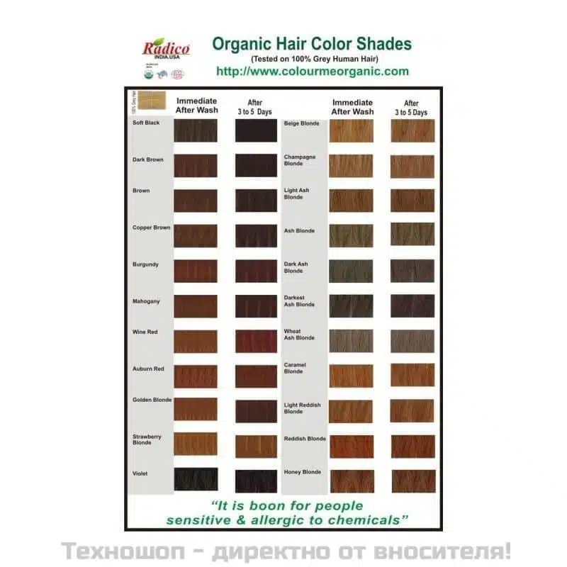 Описание: Билковата боя за коса “COLOUR-ME-ORGANIC” от Radico е смес от редки подхранващи косата билки, не съдържа каквито и да е химикали. Покрива ефективно посивелите и побелели коси с едно нанасяне. Произведена от традиционни аюрведични био билки, боята внимателно обгръща косъма за ярък и дълготраен цвят. Балансира и заздравява косата, като предотвратява пресошаването и накъсването. След употреба косата е лъскава, гъста и естествено красива. Идеалена за хора с чувствителност или алергия към химикали.
