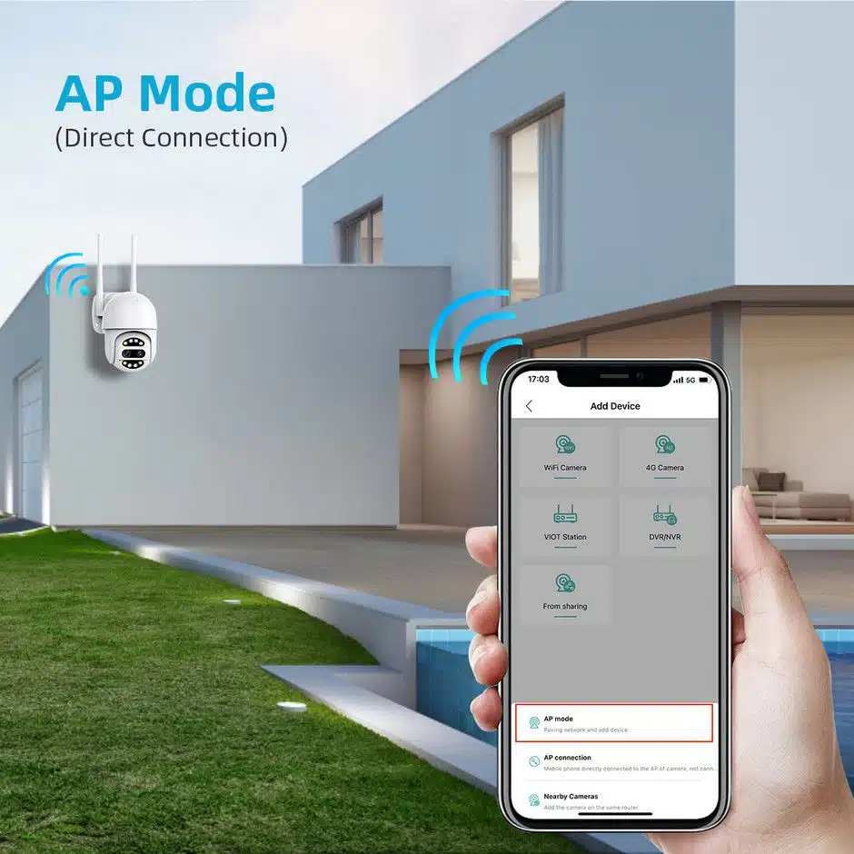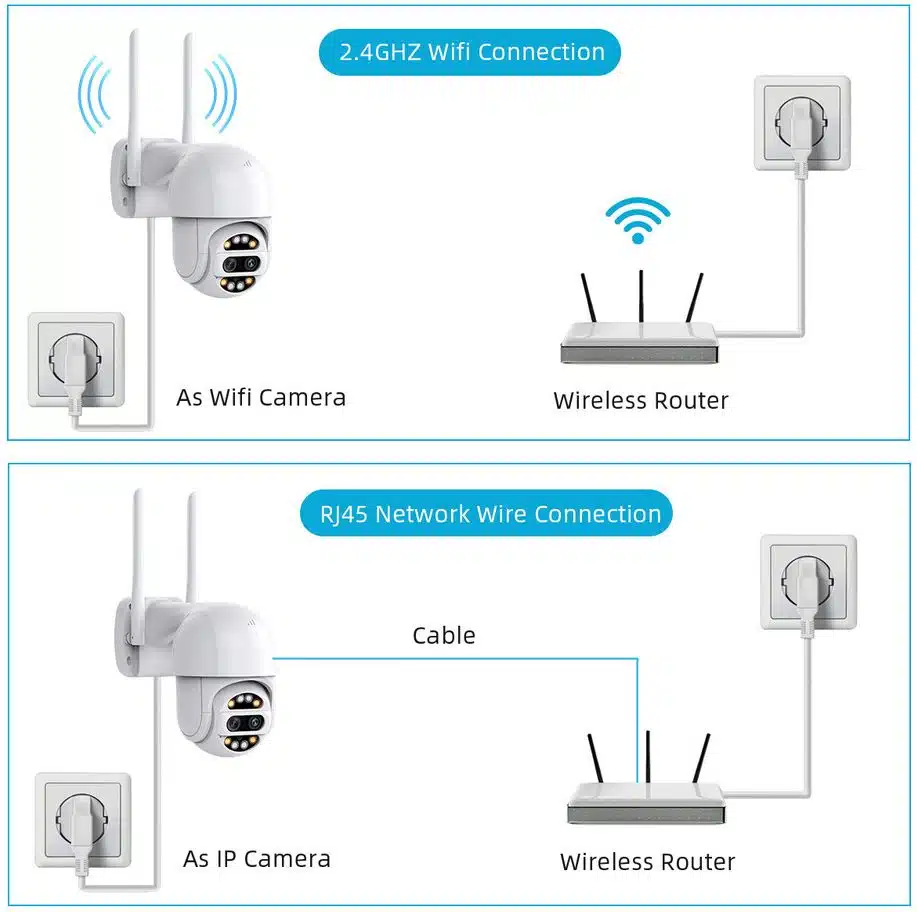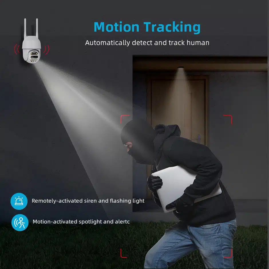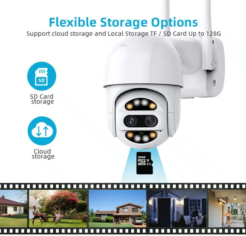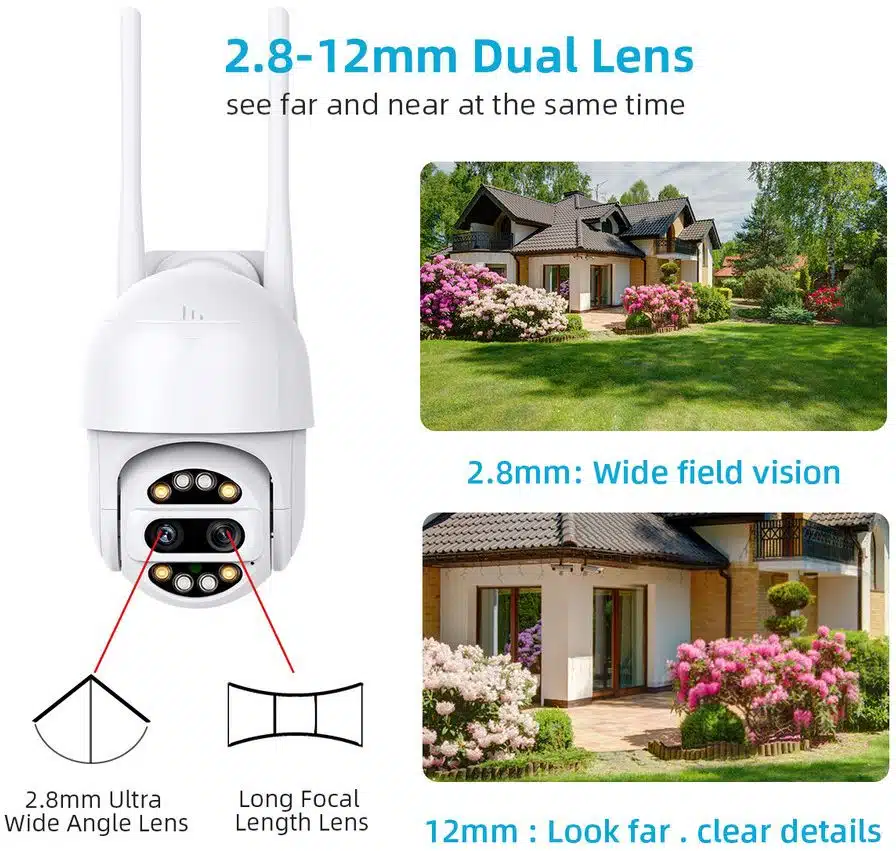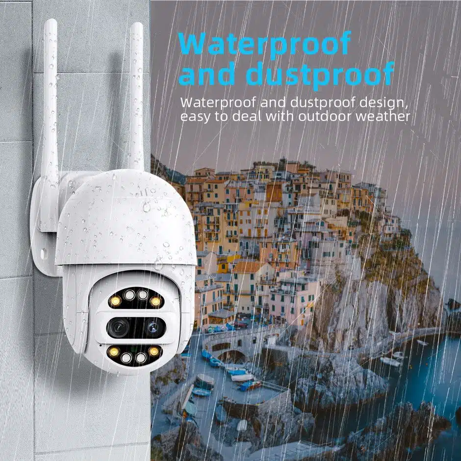 Wifi камерата Dual Lens PTZ е водоустойчива и е проектирана за външна употреба. Настройката и инсталацията ѝ са изключително бързи и могат да се извършат за няколко минути, без нужда от допълнителни устройства или кабели. Степента на защита от вода е IP66.