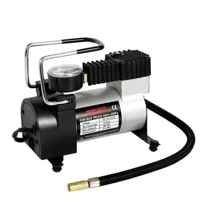 Немски комплект механичен крик тип жаба 2 тона 110 – 395 мм и универсален компресор за гуми WerkBull 12V с 3 вида накрайници