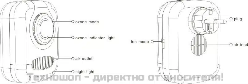 l Страничния превключвател се използва за вкл./изкл. на йон генератора и нощната светлина. Първата степен е за изключване на йон генератора. Втората степен е за вкл. на генератора на йони. Третата степен е за вкл. на йон генератора и нощната лампа.