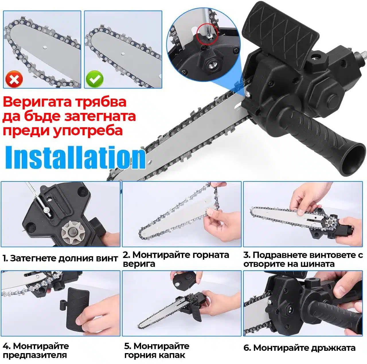 Новият продукт за 2024 г. улеснява работата и спестява време, пари и нерви. Универсалната Приставка за Винтоверт WerkBull е инструмент, който ви позволява да използвате вашия винтоверт и като резачка. С нея можете да превключвате за секунди между винтоверт и резачка. В комплекта има включен и предпазител, който е полезен, когато режете дървени греди или клони. Верижният трион лесно може да отреже клон с диаметър 10 см. С този преобразувател с 18 см шина дори не е необходимо да купувате верижен трион, което ви спестява пари и време. В сравнение с традиционните тежки електрически верижни триони, този моторен трион е по-лек, преносим и по-лесен за съхранение.