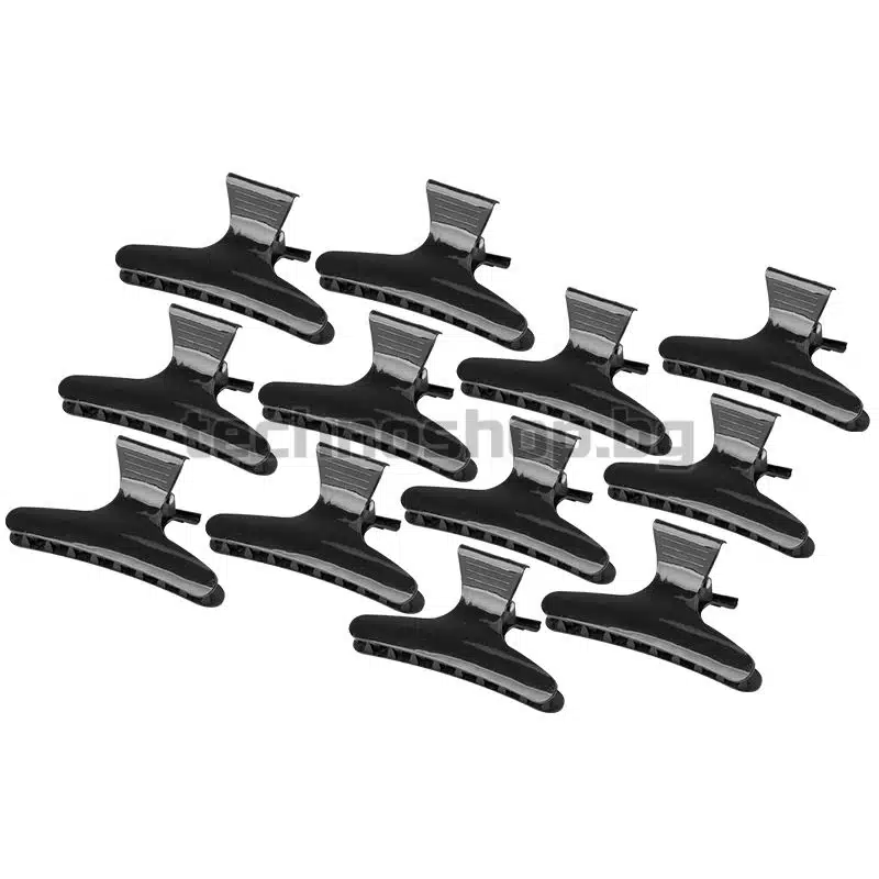 Щипки за коса – черни Kraby E-50 12 бр.Отлично качествена щипка за коса, използвана в професионалните фризьорски салони.Има здрава пружина, за да осигури трайността на катарамата.