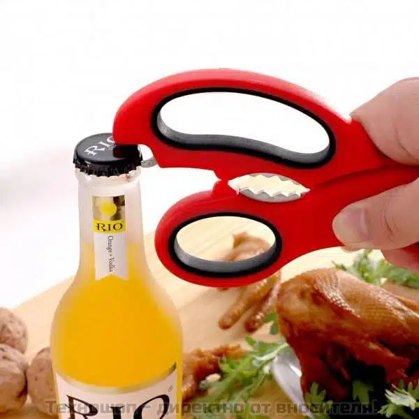 С ножицата за кухня, Вие ще можете да отваряте бутилки или малки буркани. На задната част има специално пригодена част, която се използва като отварачка.