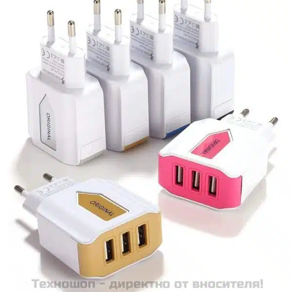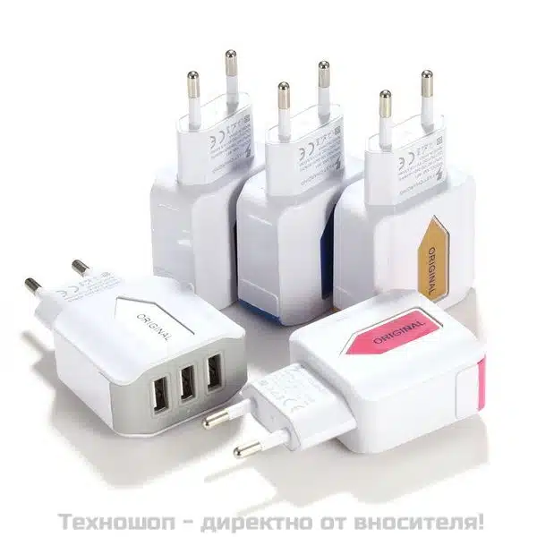 Удобен преходник, който се включва директно в захранващата мрежа (220V), след което Ви осигурява 3 USB канала, към които можете да включите всякакви устройства – мобилен телефон, таблет и други аксесоари съвместими с USB.